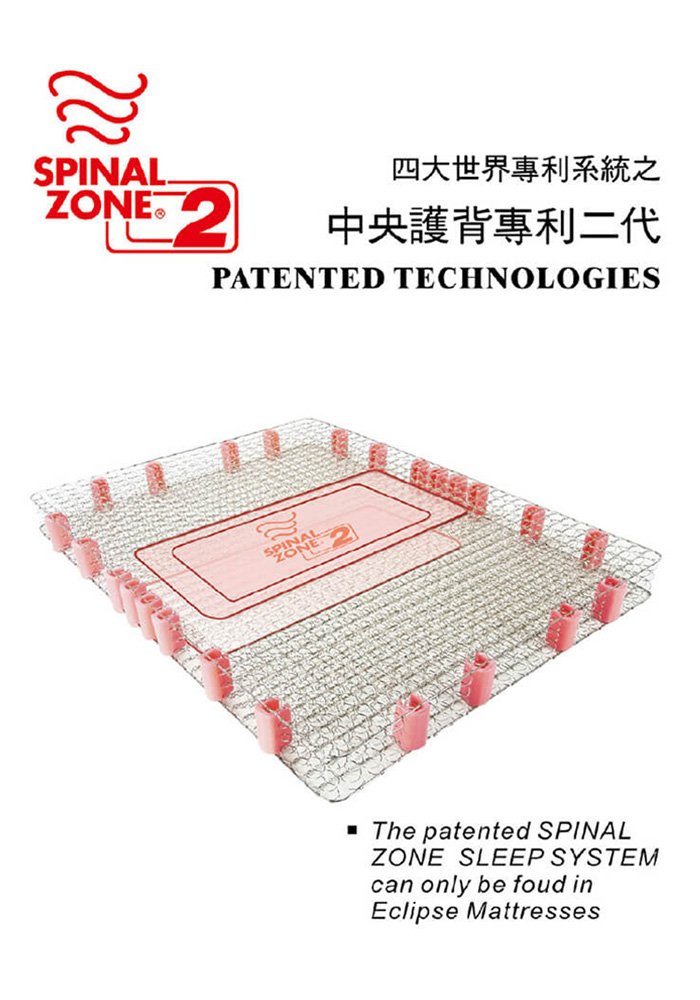 專利護背睡眠系統 Patented Spinal Zone Sleep System 與我們的專利護背車花系統 Patented Zoned Quilt Support System 相結合。這兩種護背專利提供極致的睡眠體驗,同時仍保持一個舒適的高水準。