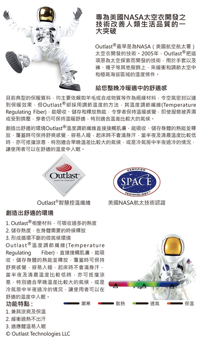 創造出舒適的環境Outlast 温度調節纖維直接接觸肌膚,能吸收、儲存身體的熱能並釋放,覆蓋時可保持舒爽感覺、容易入睡,起床時不會滿身汗,當半夜及清晨溫度比較低時,亦可抵擋涼意,特別適合早晚溫差比較大的氣候,或是冷氣房中半夜過冷的情況,讓使用者可以在舒適的溫度中入眠。